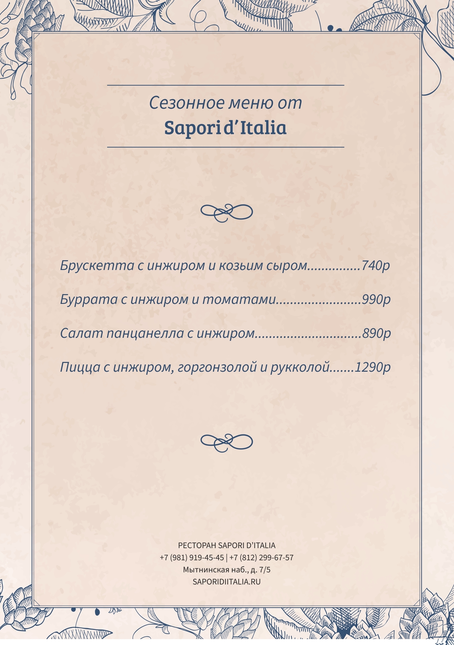 В нашем ресторане стартовал сезон инжира. Шеф приготовил для вас особенное меню: нежные закуски, потрясающая пицца и яркие сочетания, которые удивят даже гурманов. Загляните к нам, чтобы попробовать вкус осени!