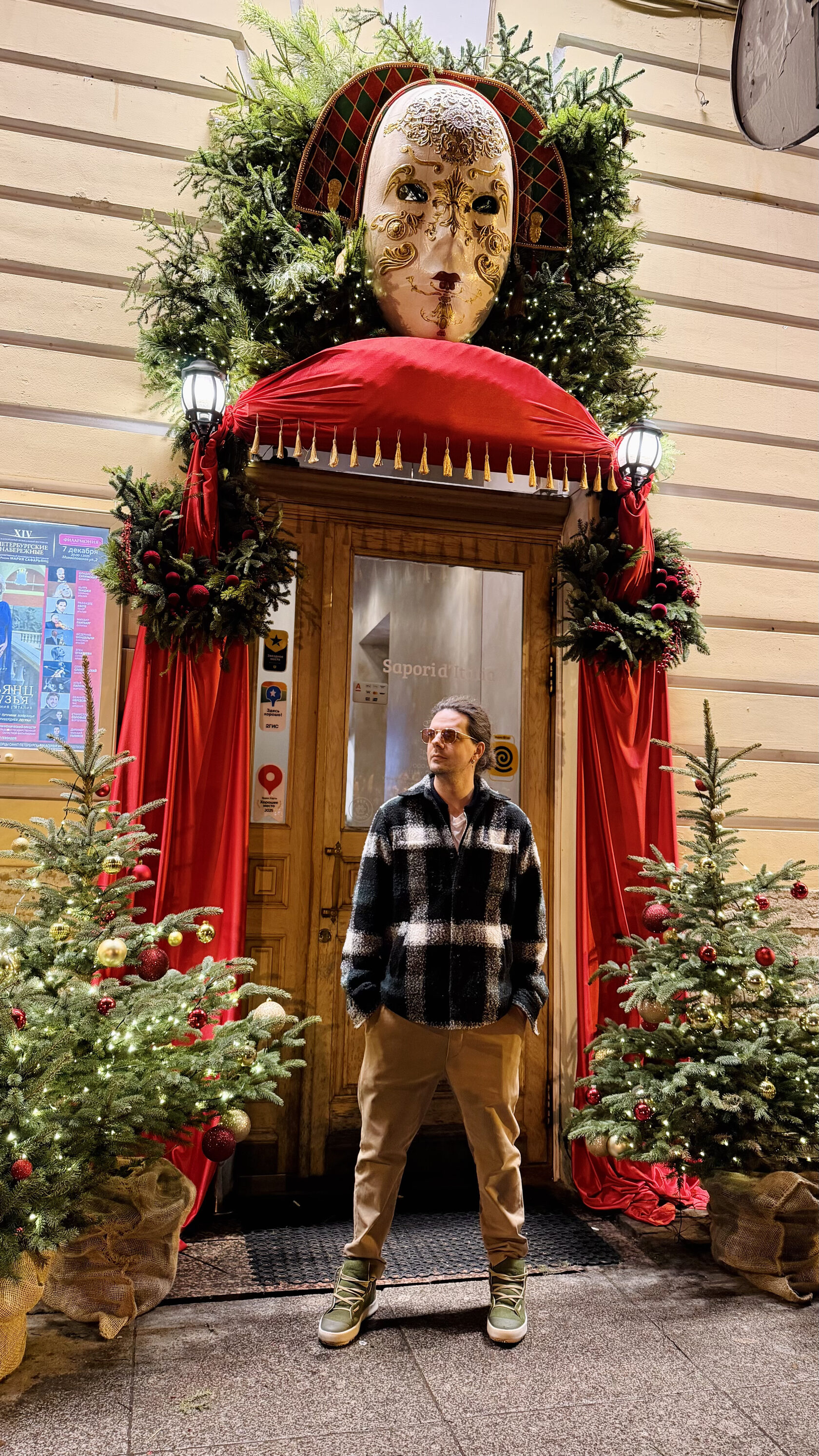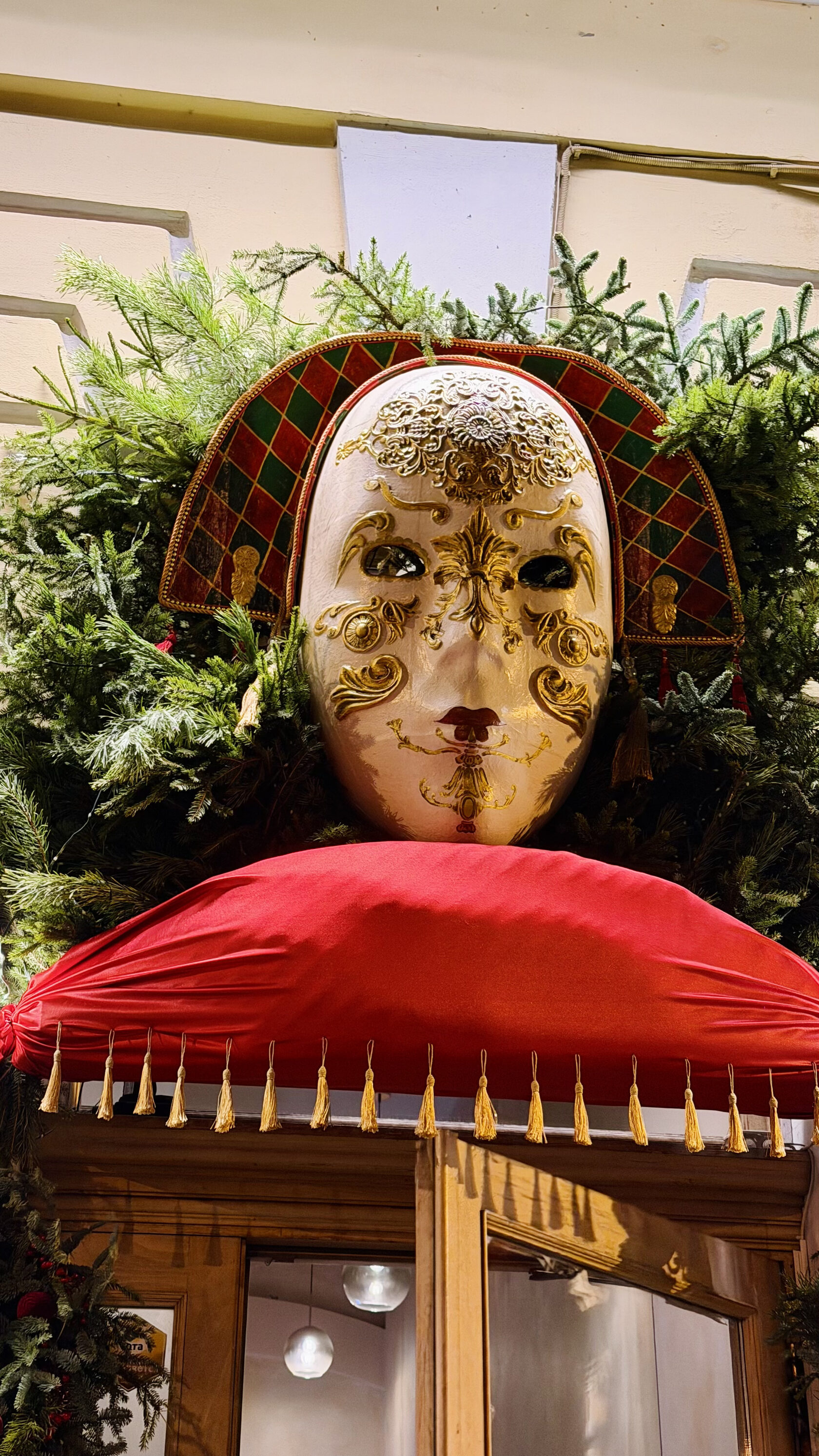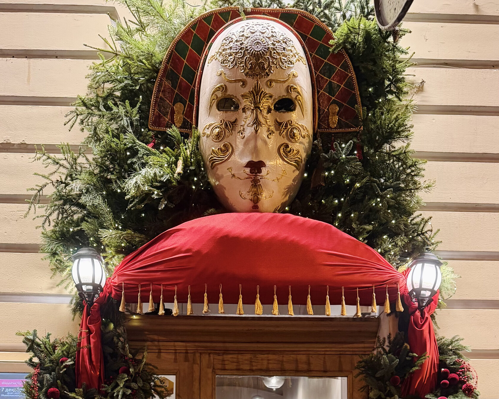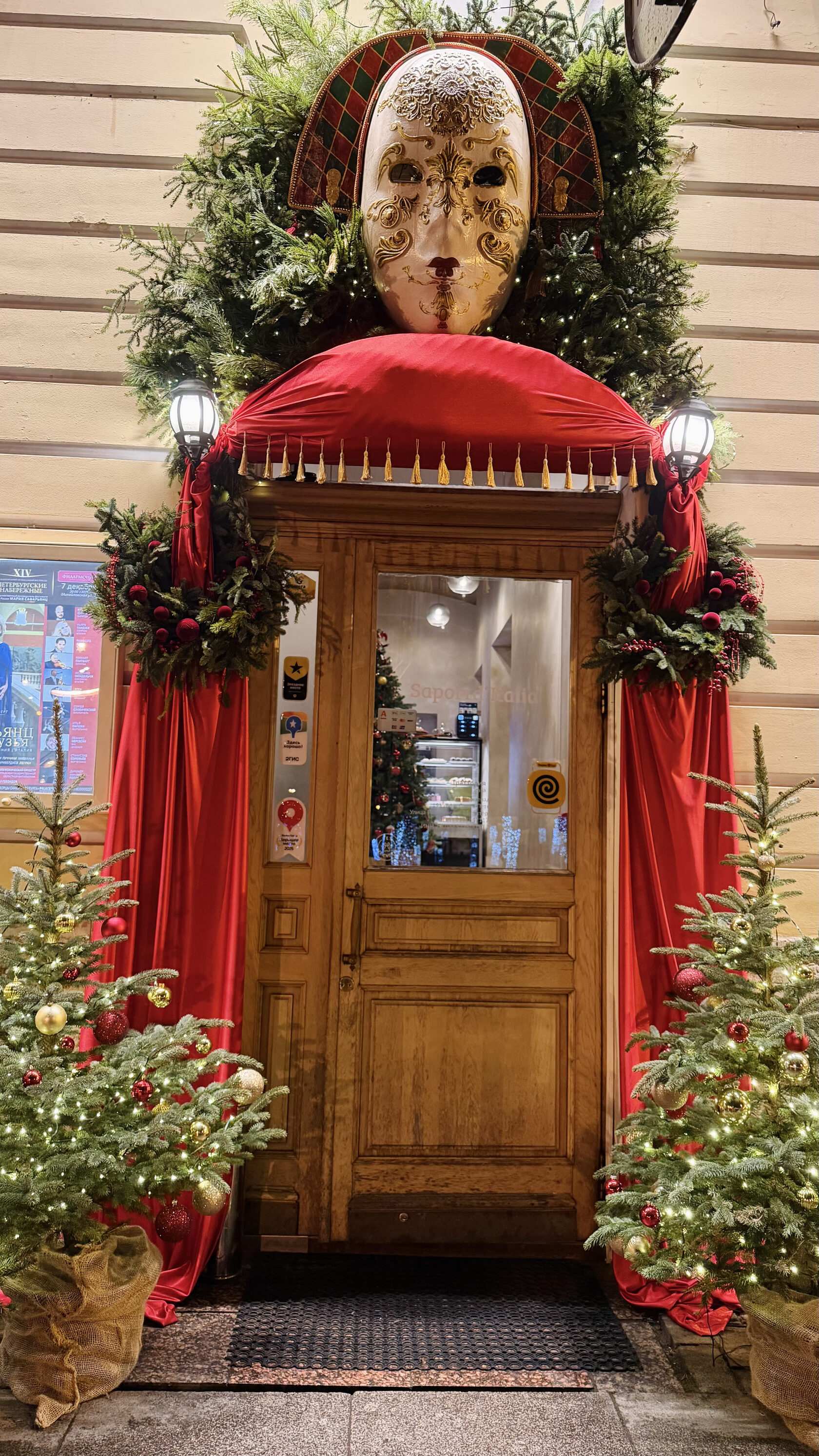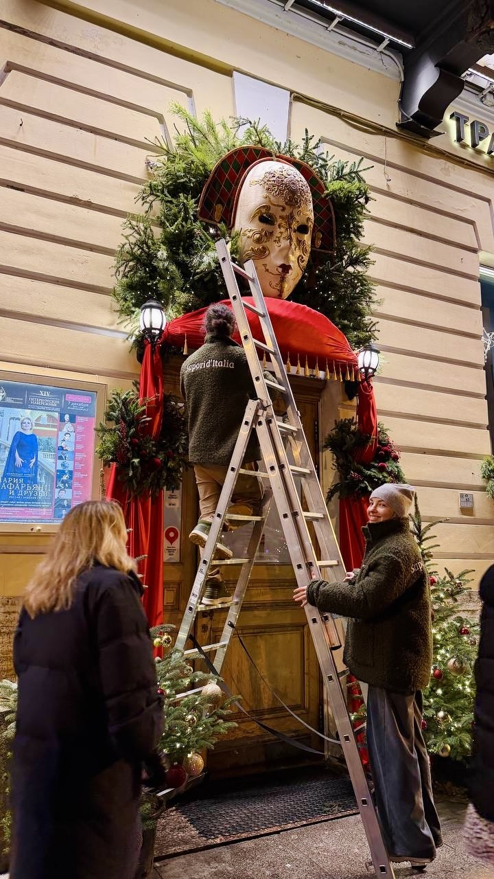 У входа гостей встречает огромная венецианская маска, настолько эффектная, что вы ее вряд ли пропустите. Она словно приглашает вас перенестись на праздничный карнавал в центре Петербурга.